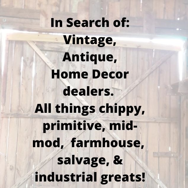 We are looking for vendors with antique and handmade furniture, vintage finds, mid-century decor, upcycled items, architectural salvage, giftables & tasty treats.